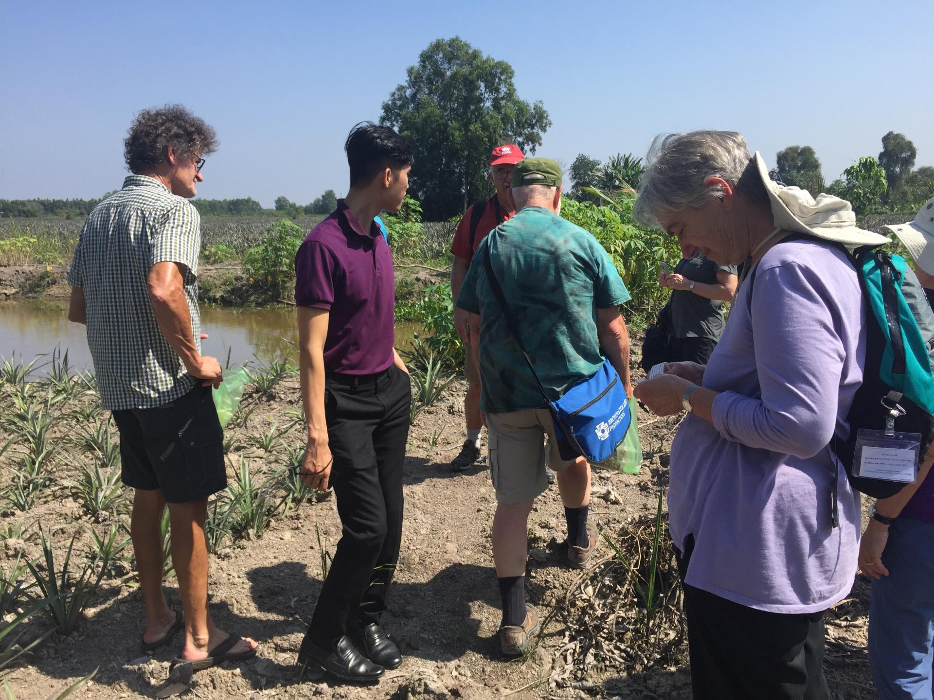 Đoàn du khách quốc tế tham quan vùng trồng khóm Tân Phước (Ảnh C.Ty Thương Mại Du Lịch VietStar)